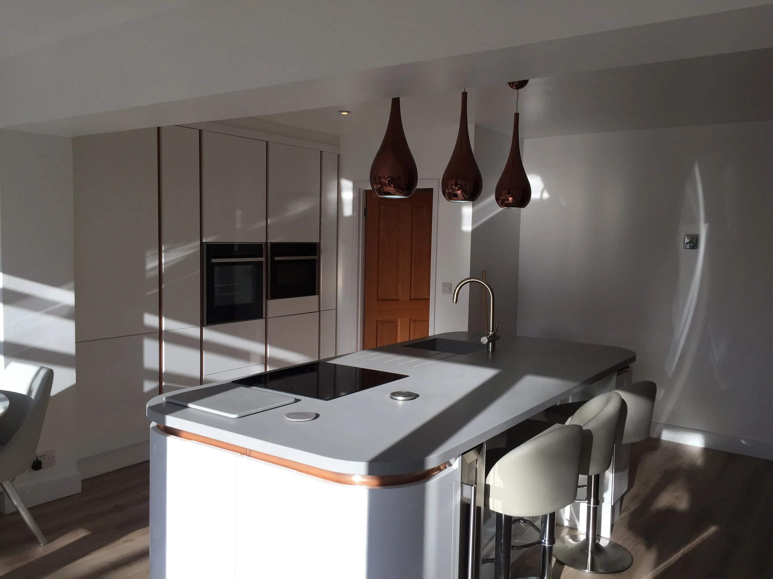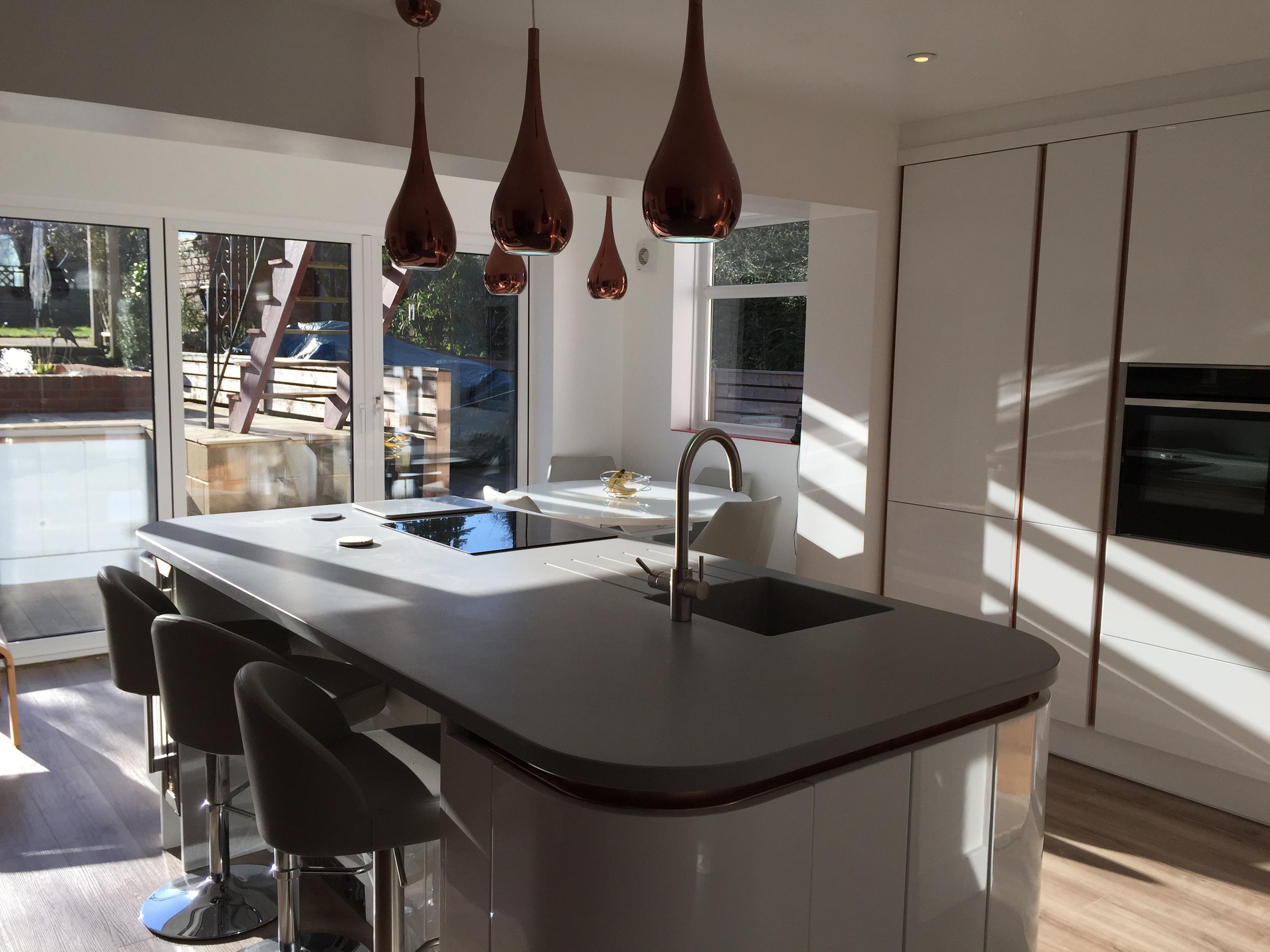 Kitchen/ dinner renovation completed in Shepherdswell. Contracted to make existing opening bigger to create an open plan space as well as creating an opening for some big Bi fold doors to exit to the garden and flood that light in. Finished by installing a stunning true handless kitchen with Corian worktops, vinyl flooring and all fixtures and fittings.